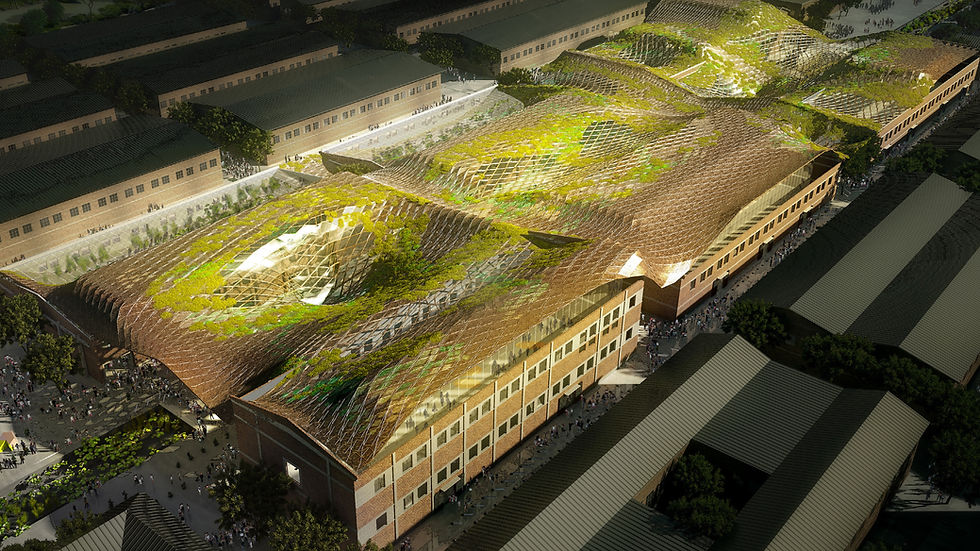 Using cutting-edge AI tools, the roof design integrates green infrastructure, reducing pollution and enhancing environmental sustainability in Beijing. The warehouses feature elevated “pendant boxes,” housing new facilities while maintaining open, free-flowing ground-level circulation, ensuring the space remains flexible and accessible.