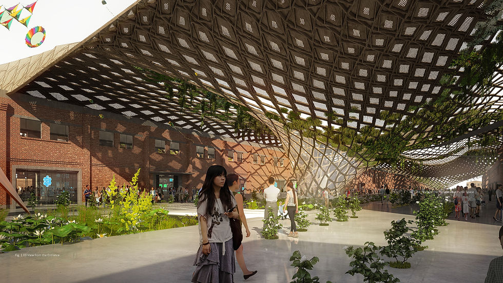 Lang Yuan Station is an award-winning architectural transformation located north of Beijing. It converts light industrial buildings into modern offices and commercial spaces. Our design reimagines the site with an innovative timber roof structure spanning both warehouses and the main railway area, creating a cohesive and striking visual identity. The central railway space has been transformed into a vibrant public hub, offering a dynamic mix of cultural venues, lush indoor green areas, and lively restaurants.