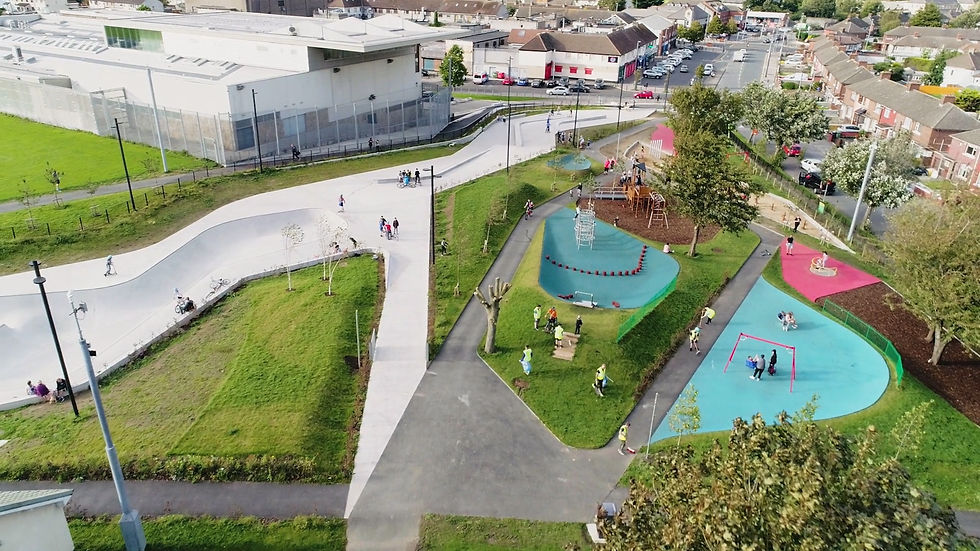Le Fanu Skate and Play Park is a striking example of inclusive and innovative urban design, reflecting the vibrant ethos of Ballyfermot’s community. The park consists of two main areas—the Skate Bowl and the Skate Plaza—each seamlessly blending skateboarding activities with public space amenities and an all-ages-inclusive playground. Designed with smooth, resin-bound rubber surfaces, the park ensures accessibility for skaters of all skill levels, offering a welcoming experience for beginners and seasoned skaters.